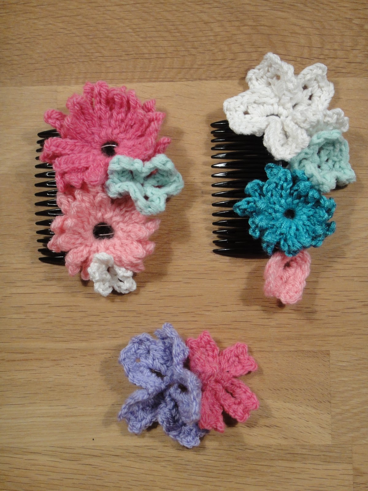 Finally, this weekend I made some haircombs with a few of the crochet flowers I made previously. They're meant to be a kind of mix up of the current English fashion for crochet flowers and the traditional Japanese fabric flower decorations that went with kimono. I'm really pleased with how vibrant they look in small groups! I'd wanted to see what it would be like to make a matching accessory to go with the teapot cover I'd already made, and start building up a kind of range. Being relatively quick and easy to make, they won't cost so much, so hopefully I can sell several to people not wanting to spend big amounts of money. I'm not too sure about the combs, as though they're traditional Japanese hair accessories, I don't think many people necessarily know how to wear them as they're not very common here (I couldn't figure out how to get them to sit in my hair either). So, I'm also looking at hair elastics and pins as well, so people can use them as corsages. A lot of people wear crochet flowers on hats at the moment. These combs I'll probably donate to the third year undergraduates to raise money to take them to New Designers in London, and see how people react to them at the sale.